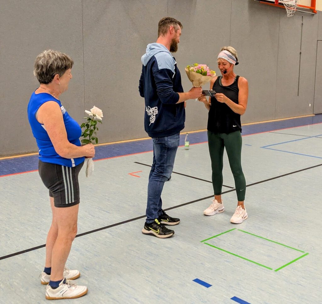 Im Rahmen ihres Trainingsbetriebs wurde auch unsere Andrea Huschenbett für ihr mittlerweile 25-jähriges Engagement als Frauensportübungsleiterin geehrt. Drei Mal pro Woche – montags, dienstags und mittwochs – leitet sie mit großer Hingabe und Kreativität die sportbegeisterten Frauen an. Dank ihrer abwechslungsreichen Gestaltung der Übungsstunden kommt bei den Teilnehmerinnen niemals Langeweile auf. Als Anerkennung überreichte ihr der Vorstand einen Blumenstrauß und eine kleine Aufmerksamkeit.